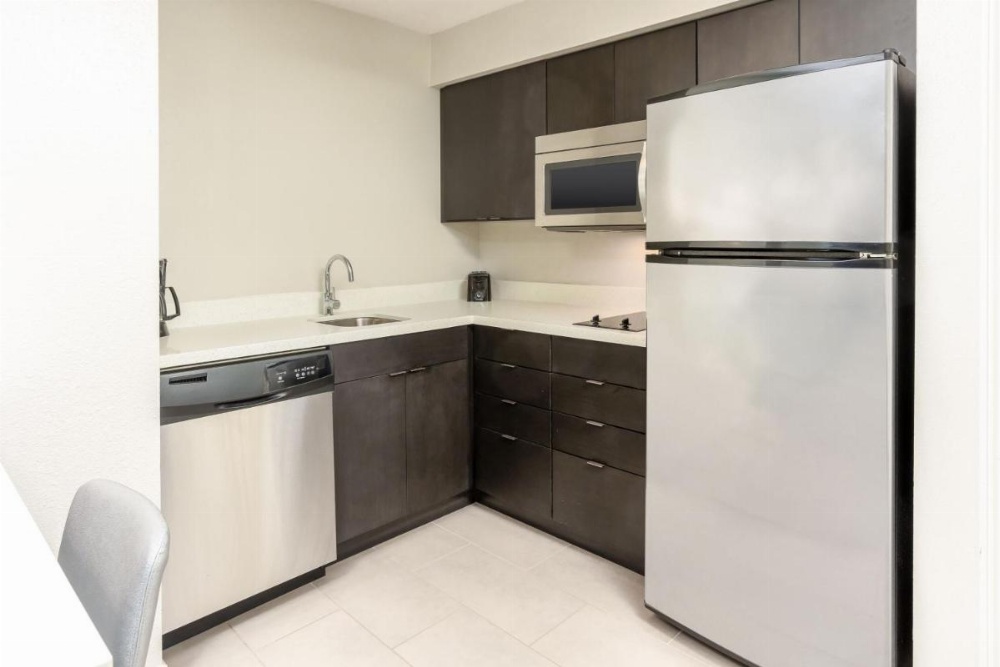 A separate living area with a cable TV is provided in this room. A fully-equipped kitchen and dining area are included.